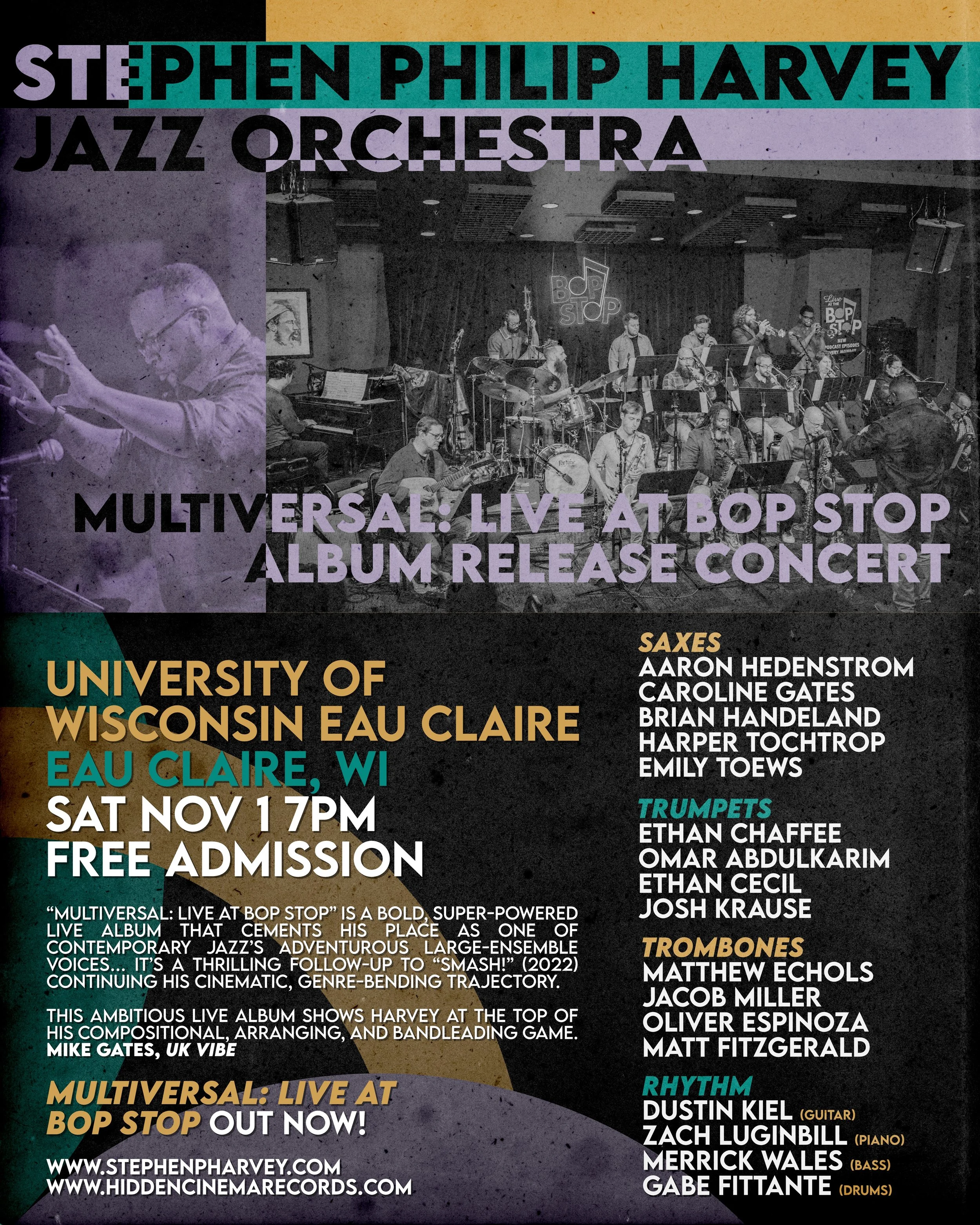 Join us for an electrifying evening of big band brilliance as the Stephen Philip Harvey Jazz Orchestra (SPHJO) celebrates the release of their new album, Multiversal: Live at BOP STOP. Captured live at Cleveland’s intimate and acoustically superb BOP STOP, this bold, super-powered recording “cements Harvey’s place as one of contemporary jazz’s adventurous large-ensemble voices” (Mike Gates, UK Vibe) and has been hailed as “a major triumph” (Michael van Gee, Jazz’n’More).