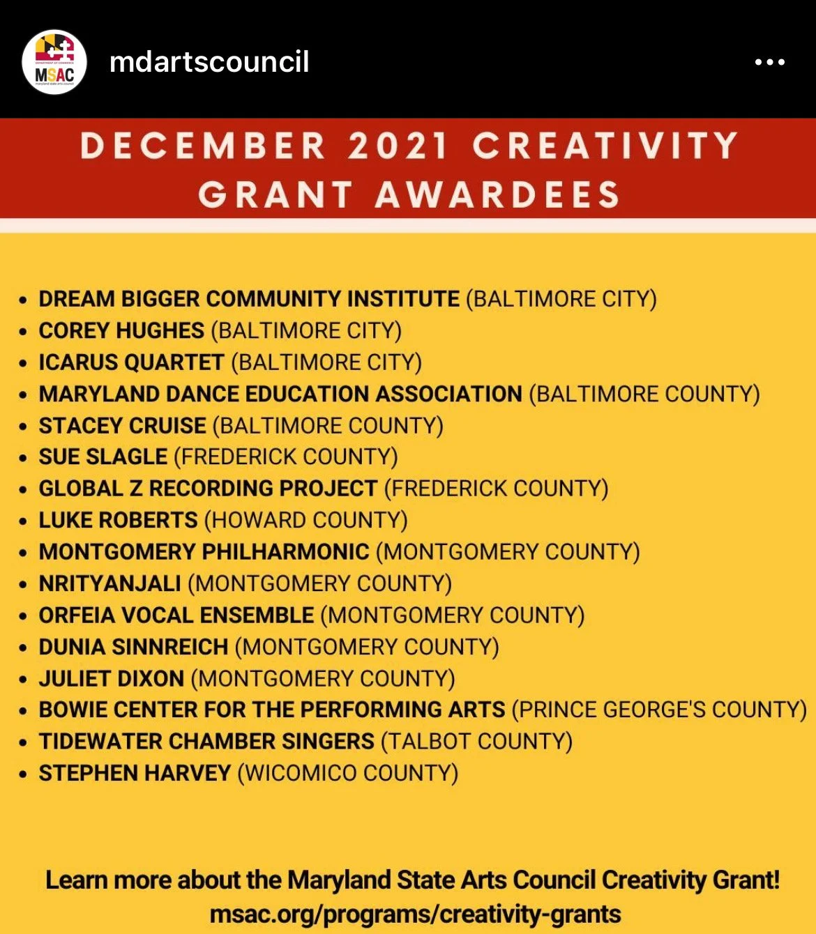 The Maryland State Arts Council’s Instagram Announcement for December 2021 Creativity Grant Awardees